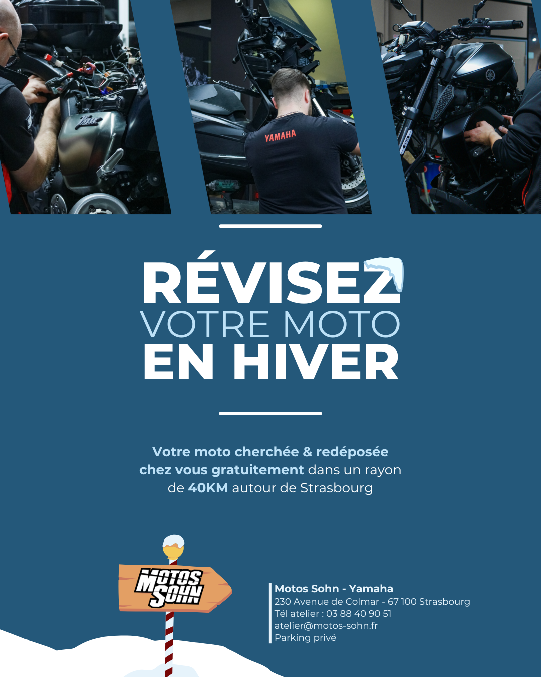 Du 6 novembre 2025 au 28 février 2026, votre moto cherchée et redéposée chez vous gratuitement dans un rayon de 40 km autour de Strasbourg ! C'est le moment de faire votre révision ❄
