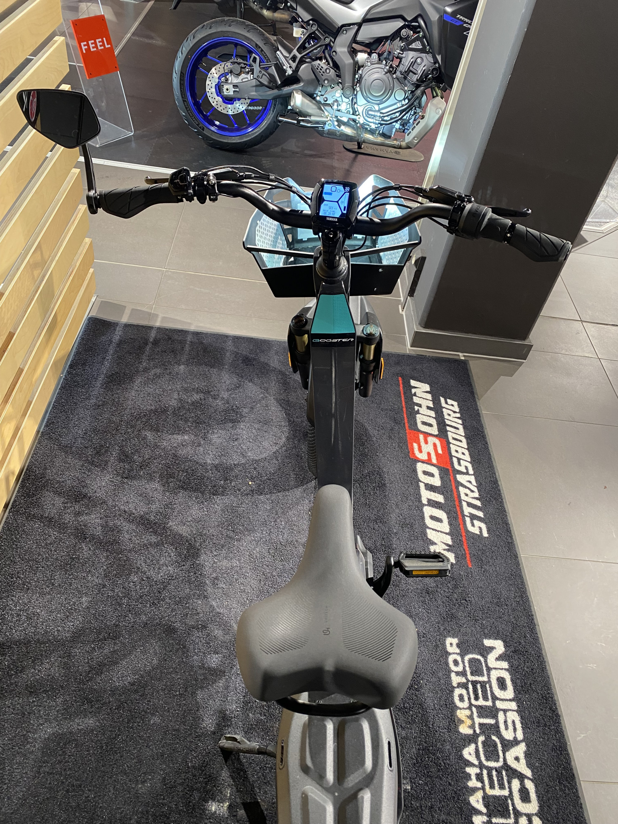 Cyclomoteur BOOSTER à assistance électrique, marque Yamaha. En parfait état, avec panier à l'avant. Prix ferme, vélo de collaborateur. Nécessitant le permis AM. Avec écran TFT en couleur et éclairage à LED.